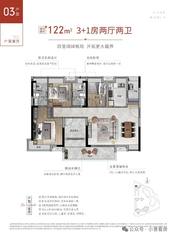 建面约122㎡3+1房,横厅设计,零过道浪费,特别适合二胎三胎家庭。