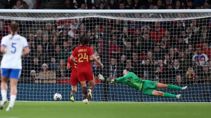 11月29日,中国队门将潘红艳(右)未能扑出英格兰队球员的射门。 新华社记者 李颖 摄 本场比赛之后,中国队将赴西班牙继续拉练,备战明年三月在澳大利亚举行的亚洲杯比赛。