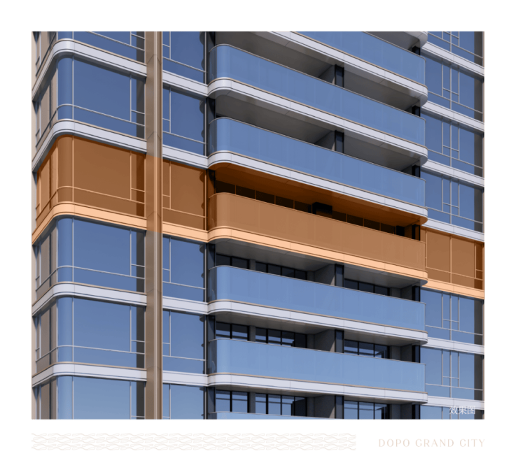 二期公建化立面设计,主立面铝板+玻璃用材占比约92%,约270°环幕飘窗设计,带来更开阔的视野体验