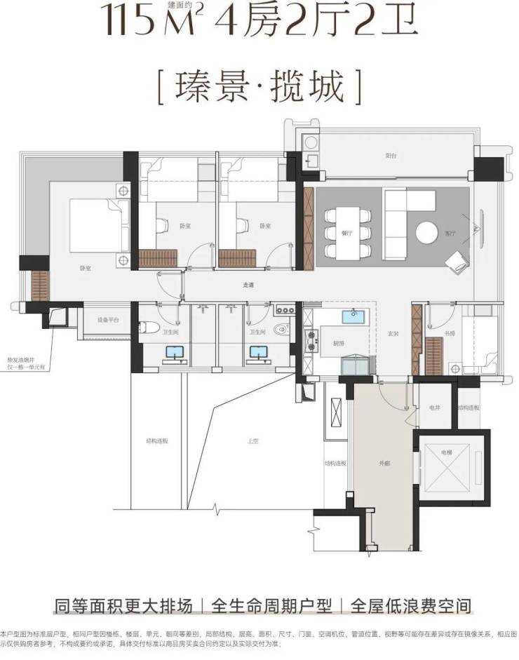 项目推出的 115-143㎡纯四房,主打 “全生命周期” 设计,空间灵活度极高。以 115㎡户型为例,可通过拆除非承重墙实现 6 米环幕横厅,无论是单身贵族、二人世界,还是三代同堂,都能根据需求调整空间功能,让房子随家庭成长而 “进化”。