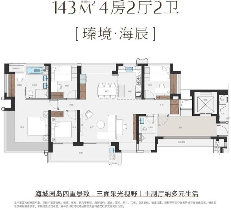 主力户型: 面积从114㎡到143㎡不等,纯四房设计