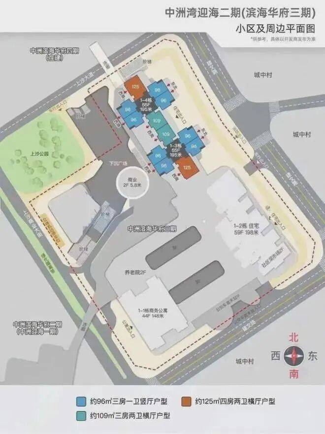 本次开盘共两个单元,楼体朝向东南,不仅可以远观海景,近处还可以俯瞰与一期围合成的社区绿地。中洲湾迎海售楼处电话:4008368707,大部分户型朝向东南,少数户型朝东北。其中,96㎡的三房一卫是本次的主力户型,预计有372套;109㎡的户型预计95套;125㎡的户型共有93套。
