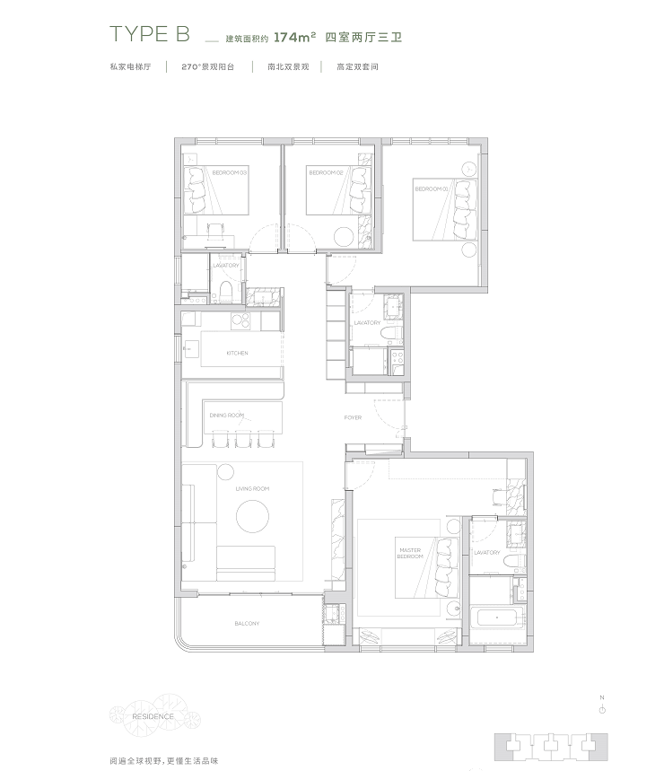 174产品为四房两厅三卫产品,打造了端户边厅布局,形成LDK一体化。无界的室内空间畅游体验,在平淡的日常里体验着生活的华章。