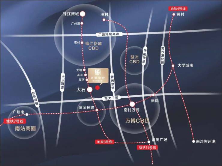 地铁3号线|黄金大动脉3号线大石站,约900米,2站万博CBD/海珠,6站达珠江新城/琶洲。