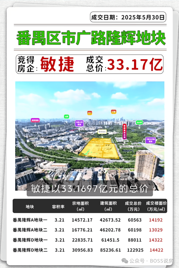 2025 年 5 月 30 日,敏捷集团以总价约 33.17 亿元拿下番禺区钟村街市广路隆辉四宗地块,折合楼面价约 14081 元 /㎡。