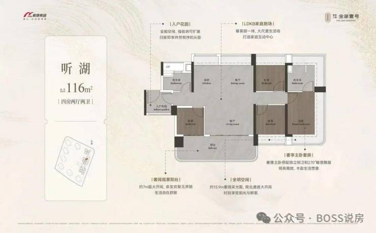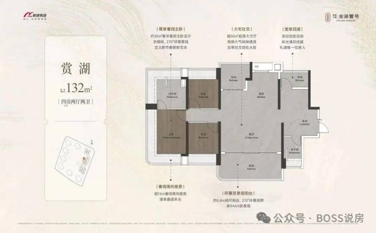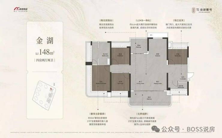约98-148㎡全南向湖居四房,对标当代华宅范本,创变居住空间的新想象;全南向新规的突破、环拥天地的居住空间、精工雕琢细节之美,打造湖居理想之家,为万博CBD钜献湖居壹号作品。
