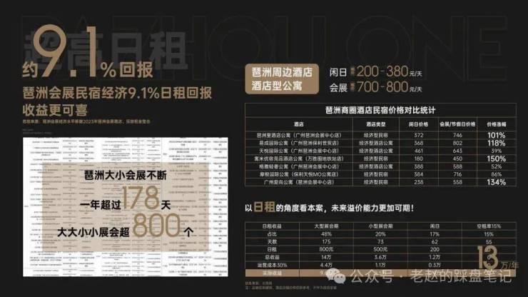 ▪会展 租价700-800元/天(信息来源:贝壳网)2023年琶洲展会全年举办800场,共178天,以会展租价计算,区域内商办产品一年最高可达13万/年超高收益,民宿经济约 9.1%日租回报 更可喜!