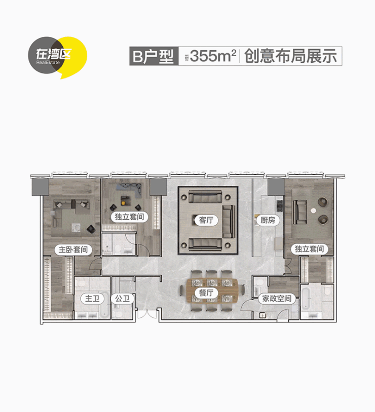 建面约355㎡户型,板式方正格局,一体化双厅,收揽一线江景与繁华。