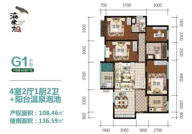 G1户型建面约108㎡,四房两厅两卫