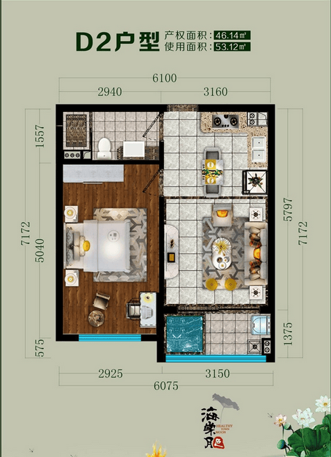 D2户型建面约46㎡,一房两厅一卫
