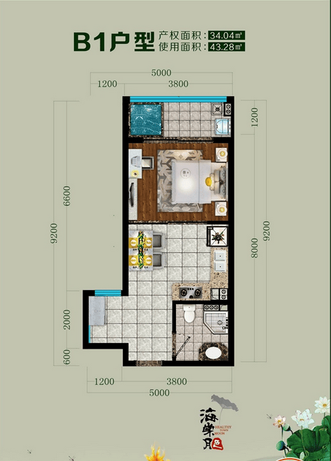 B1户型建面约34㎡,一房一厅一卫