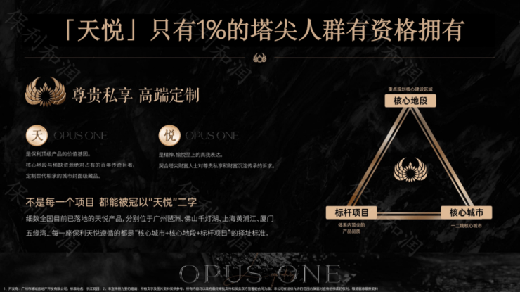 属于保利顶序产品系,全国仅有15座天悦,“天悦”属于“TOP”系,是保利超越以往全系列产品线的收藏级作品,保利在全国布局了超900个项目,仅1%塔尖人群可拥有“天悦”。