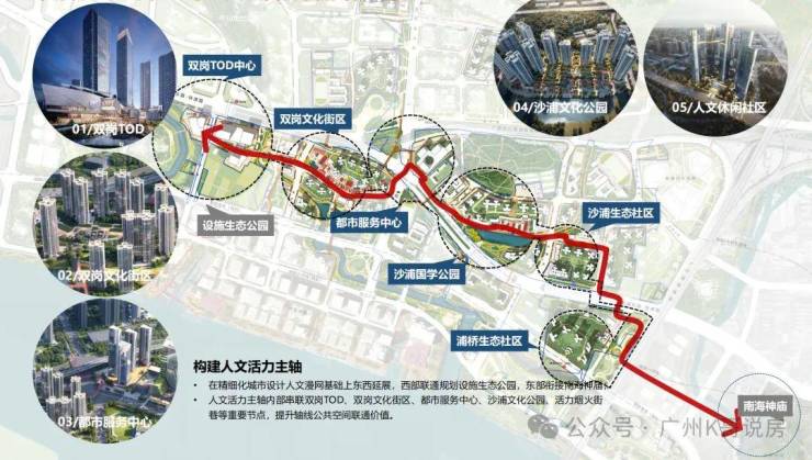 西至设施生态公园,东联南海神庙,构建串联TOD商业、文化街区、都市服务、生态社区等重点项目的漫游活力轴,重点塑造“双岗TOD中心、都市服务中心”两大综合商业地标及“双岗、沙涌”两大休闲文化街区,目前双岗TOD中心已确认引入华润万象系商业运营。