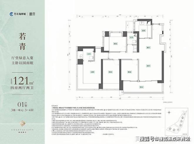 121㎡横厅四房:奢阔尺度餐客厅一体化设计,约6.5米宽景阳台连通主卧,空间感媲美140㎡户型,东南或西南朝向,约12米采光面。