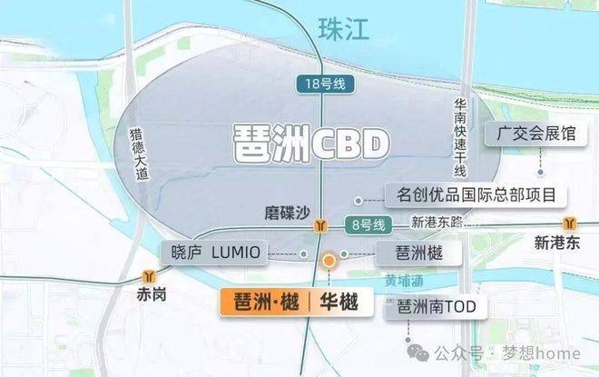 最近的地铁,还是琶洲西区最核心、8/18号线双线交汇的磨碟沙地铁站,仅隔着一条新港东路,直线距离约200米。