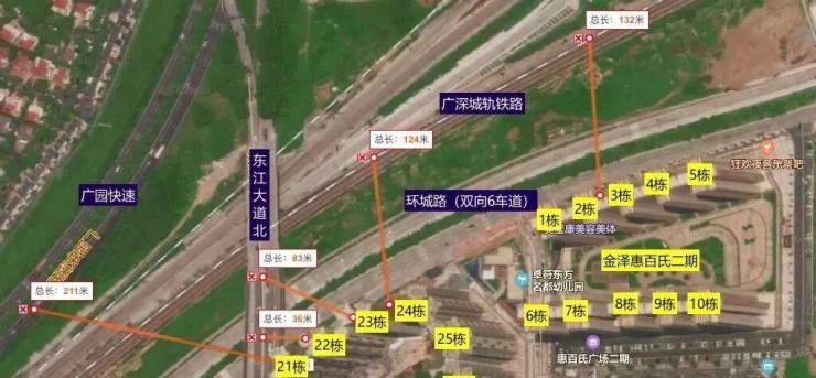 东方名都和惠百氏周边最大的不利因素是楼下即环城路,以及靠近广深城际铁路。