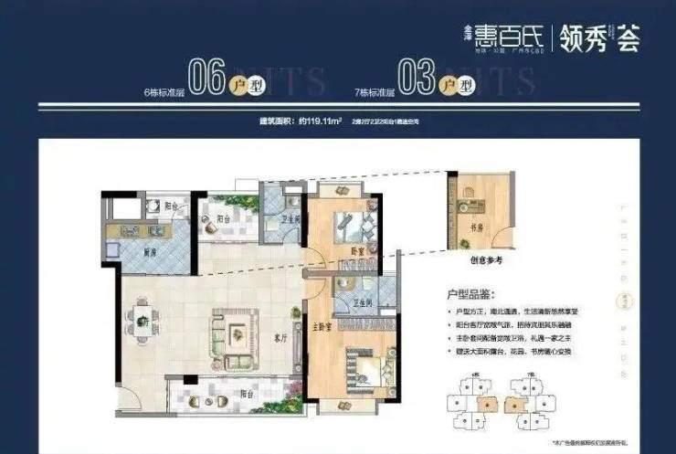 惠百氏主打刚需,2梯6户。面积段相对简单,75方两房,105方2+1房,119方2+1房,121方2+1房。