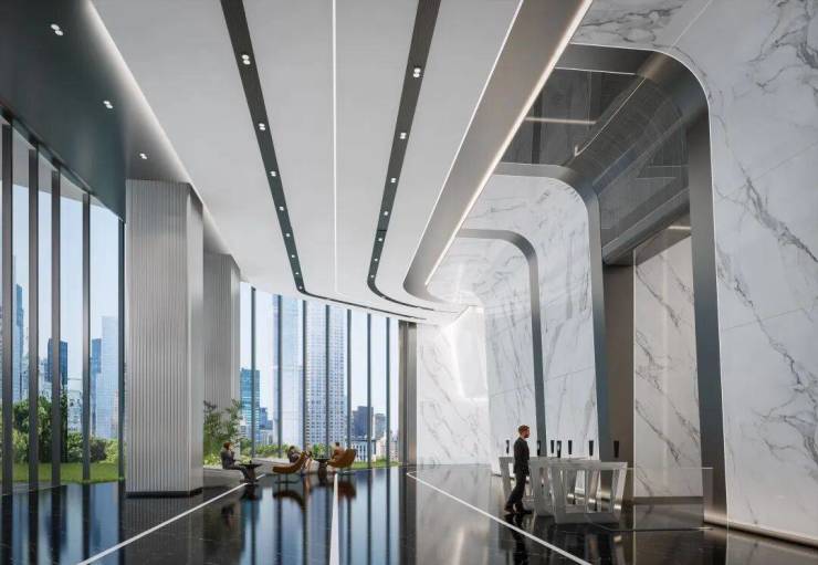 项目大堂搭配意大利进口云纹石材曲面墙面设计,以三维冷弯工艺雕琢成环绕建筑的时光幕帘。晨光漫过32°倾斜的穹顶,那些被精心计算的折射角度,会在中庭洒落不断变幻的光瀑。近乎奢侈的曲面叠加、仰首可见的流线型穹顶与流转的光影、环绕四周的云纹肌理,则沉淀着百年石材历经地质运动的从容气度。南入户大堂外将会改造玻璃房,目前规划引进新派咖啡厅,兼顾商务社交与办公需求。