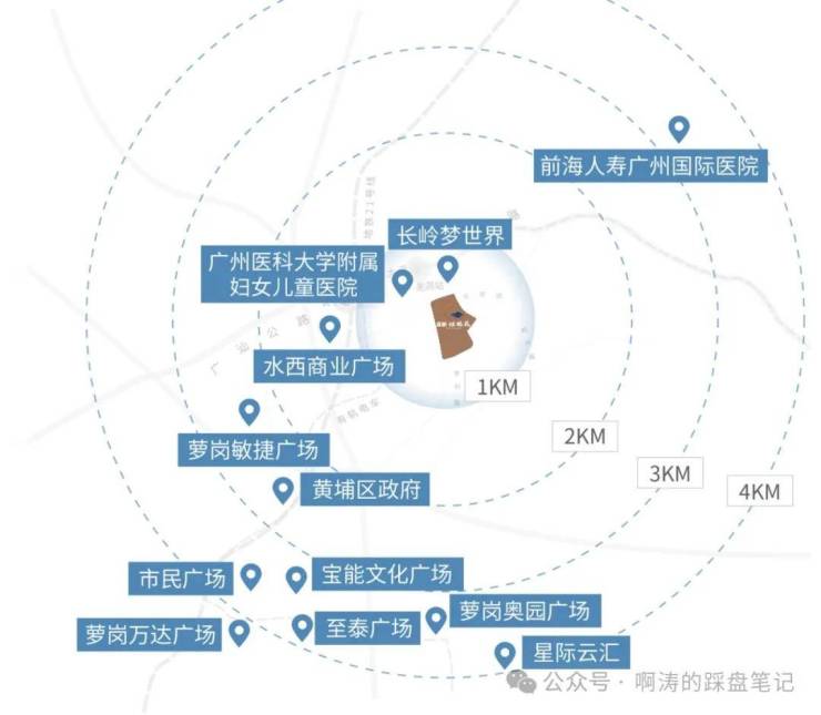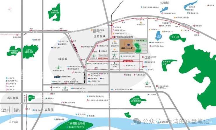 2大轨道交通+5大城市主脉:直线距离约800米地铁21号线长平站,1站黄埔区府(水西站),2站万达广场(苏元站),5站到天河(天河智慧城站);步行约400米有轨电车1号线羌洞站,1站换乘21号线;广州绕城高速、香雪大道、广汕公路、开创大道、开萝大道等主干道。