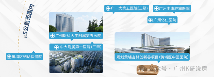 附近几所三甲医院中大附属第一医院(三甲),广医大附属第五医院(三甲)、黄埔区中医医院、广州市黄埔区妇幼保健院等,都在2公里之内。