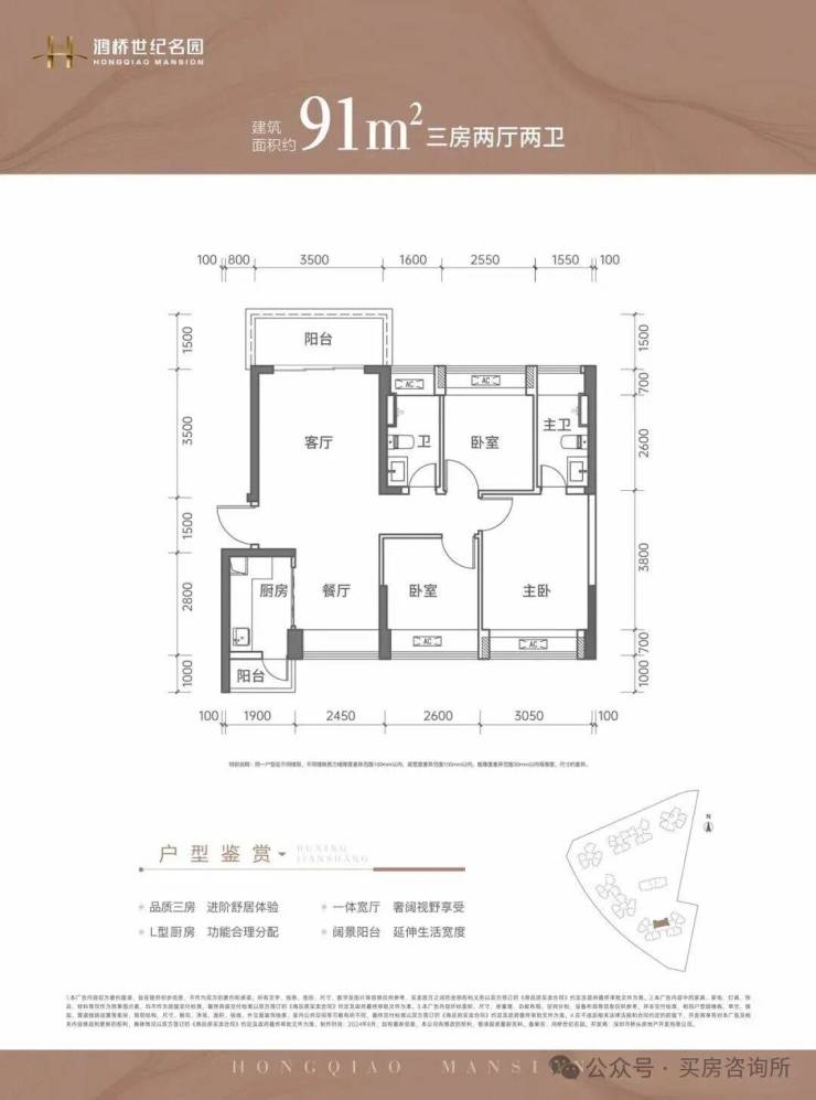 91㎡的3房2厅2卫,设计的是竖厅南北通透格局,客厅3.5米开间,LDKB一体化设计,3个卧室分别做到了3.05米/2.6米/2.55米的宽度,L型厨房带1个小生活阳台,卫生间干湿分离,阳台主朝正北向。