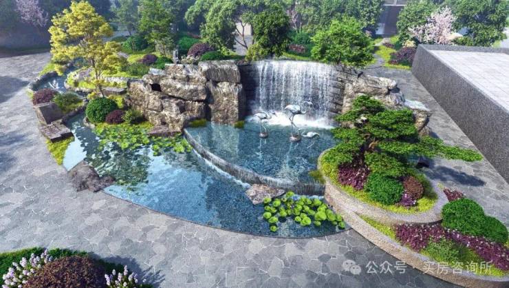 逸趣园林三重水景:提取凤凰山的形态纹理将自然山林元素与现代都市生活有机结合,在有限的面积之中,还原无限的自然山水之趣。