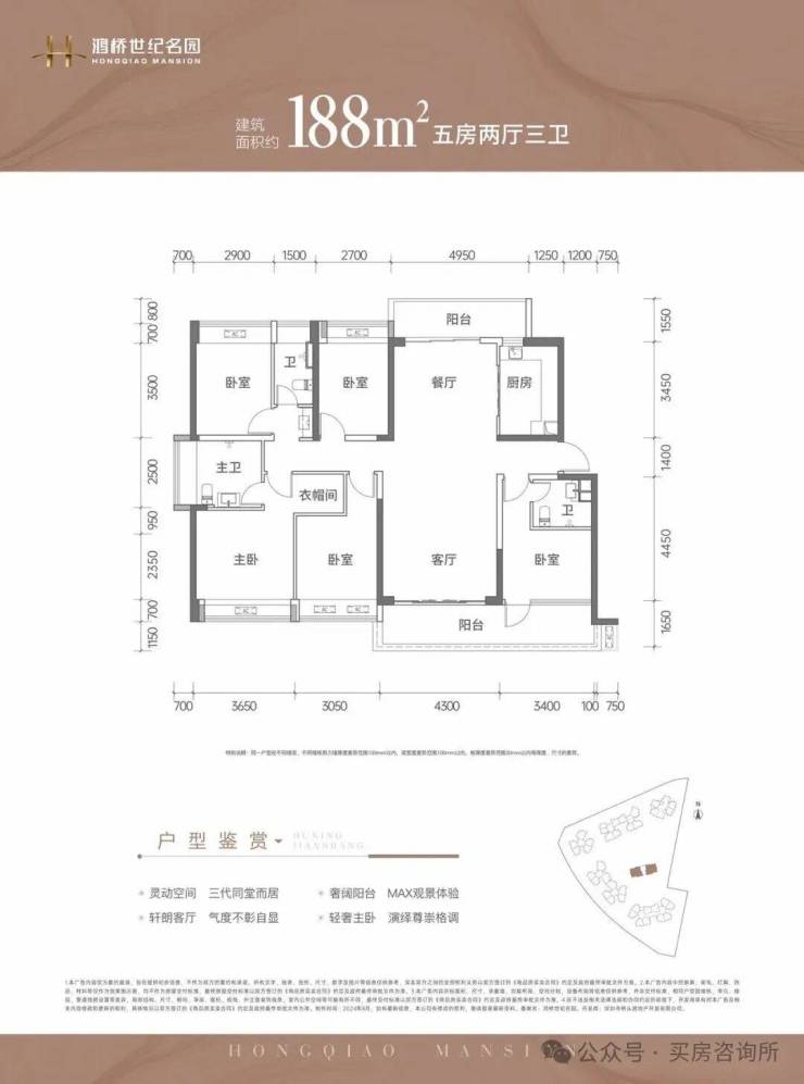 188㎡的5房2厅3卫,设计的是竖格局,南北通透双阳台,客厅4.3米开间,LDKB一体化设计,双主卧套间设计,5个卧室分别做到了3.65米/3.4米/3.05米/2.9米/2.7米的宽度,L型厨房带1个小生活阳台,公卫三段式分离,客厅阳台连接次卧出7.7米长的大阳台,主朝正南向。