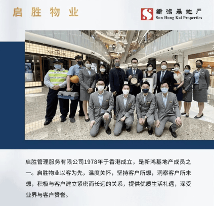 启胜物业,44年物业管理经验,管理多个国际级商厦及重点物业,包括环球贸易广场、天际100等。