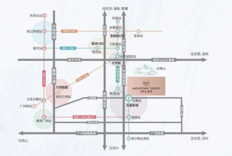 自驾的话15分钟到达番禺广场、20分钟到达大学城,25分钟到达琶洲CBD,30分钟到达广州南站、佛山顺德、35分钟到广州金融城和珠江新城等老城区。