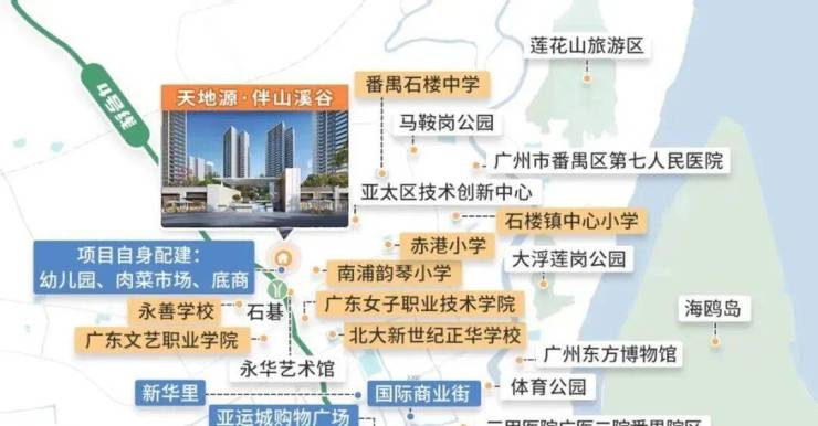 天地源伴山溪谷位于石基板块,可乘坐4号线直达。出站后使用导航前往项目中心,距离约600米左右,步行仅需几分钟。从地理位置来看,确实比亚运城更接近地铁,对于在金融城或琶洲工作的人来说,通勤十分便利,且距离珠江新城也更近。亚运板块目前在售项目有4个,虽然近年地铁概念为亚运板块引来大量白领,但真地铁盘其实仅天地源·伴山溪谷一个。