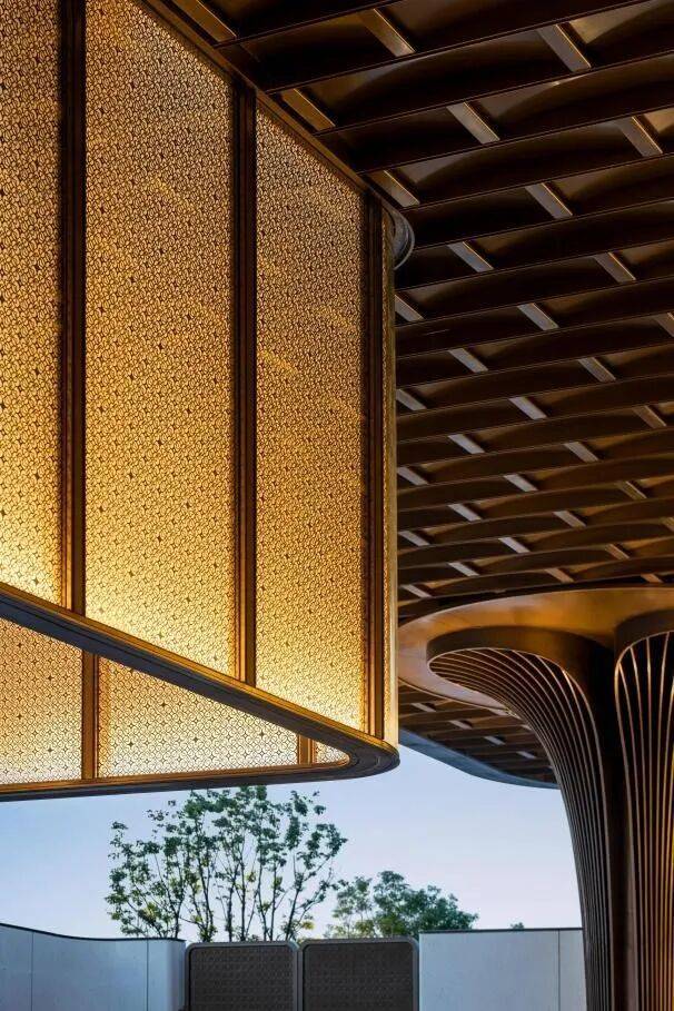 星曜会所的独特从外部空间便已彰显。中国建筑讲究导气,所以就有了“照壁”来阻挡气流,守卫家宅平安。天曜的照壁采用了一种特殊的工艺:电镀金鳞片。