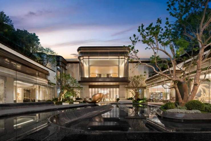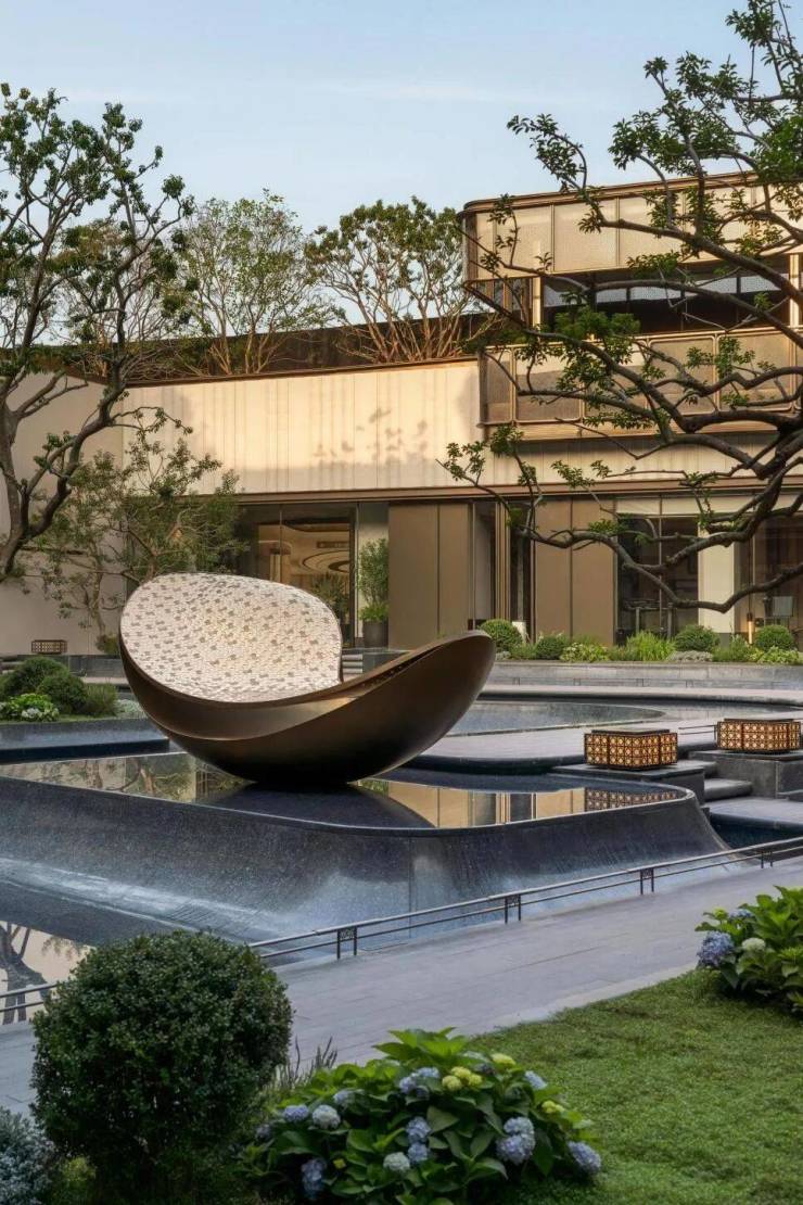 下沉庭院以精致金属线条搭配玻璃材质,极具现代时尚。前庭水景设艺术雕塑和繁茂绿植,镜面透出建筑倒影,自然且舒适。