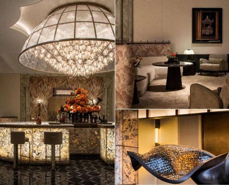 透过中空挂落,日光倾泻而入下方的“金石浮光”的艺术雕塑,阳光与金石肌理交织出细腻的纹理,低调奢华的氛围扑面而来。
