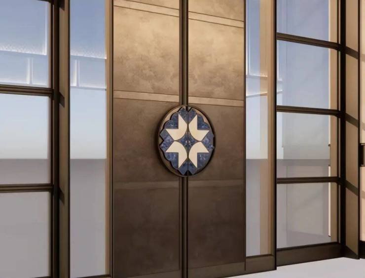 省级非遗大师杨志峰定制牡丹胎画珐琅门把手,以八芒星logo为脉络形成的珐彩福门是会所一楼空间的总起。