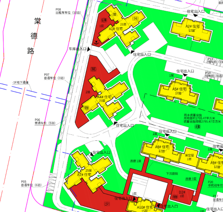 交通组织:人车分流,人行主入口位于 A 地块 10-11 栋、B 地块 3-4 栋之间;车行入口分布于东、西、北侧。
