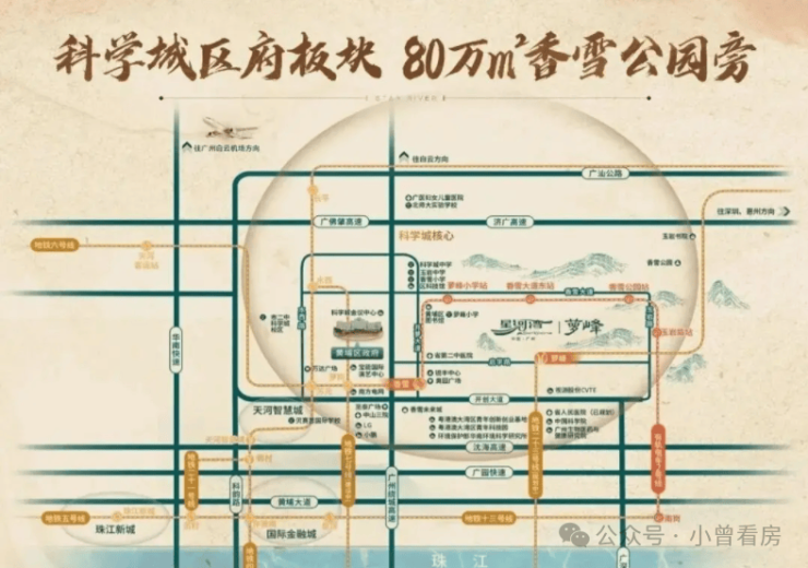 交通出行方面,项目紧邻广州地铁 6 号线香雪站,2 站到苏元站可换乘 21 号线,3 站就能抵达天河;规划中的地铁 23 号线半山站预计 2026 年通车,未来能无缝衔接珠江新城。