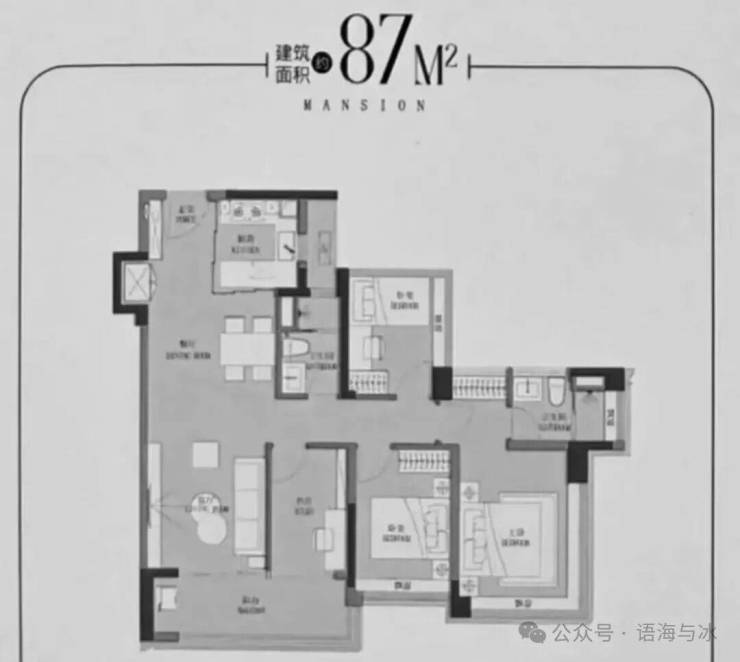建面87平3+1房,跟云悦88平几乎一模一样。
