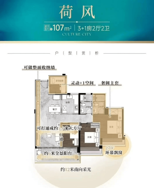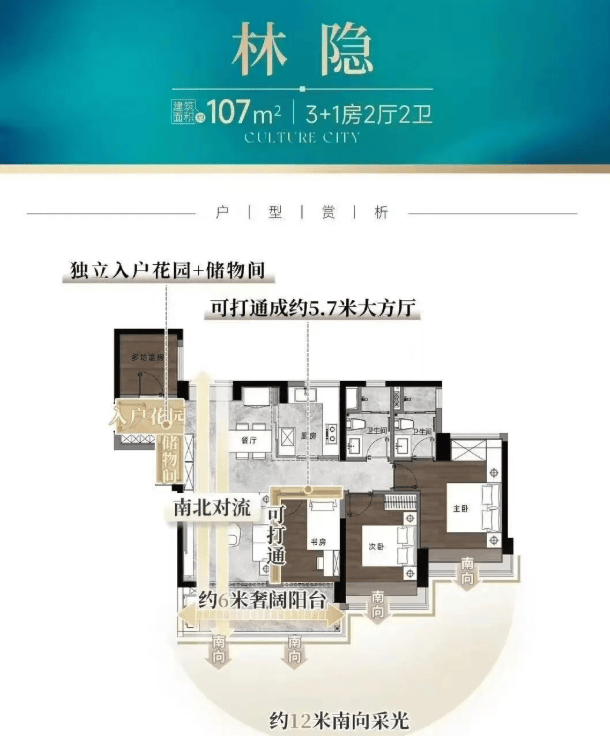 建面约107㎡:四房设计,拥有12米南向采光面,通透LDK一体化,约6米奢阔阳台,带独立入户花园。