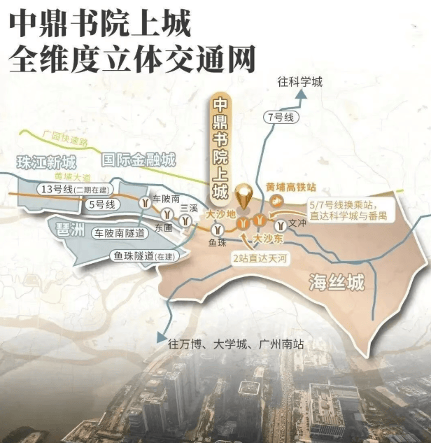 中鼎书院上城珺翎府距离地铁5号线大沙地站仅600米,步行即可到达,无需换乘即可直达金融城与珠江新城。周边还有广园快速和黄埔大道两条快速路,贯穿广州东西,方便快捷。此外,项目紧邻三地铁、高铁枢纽,出行十分便利。