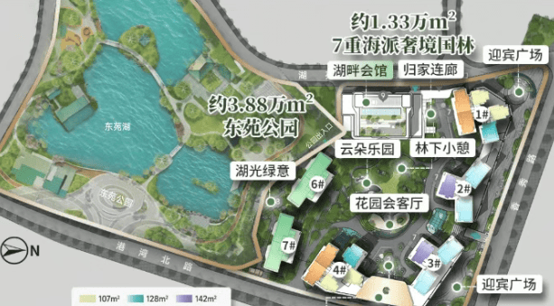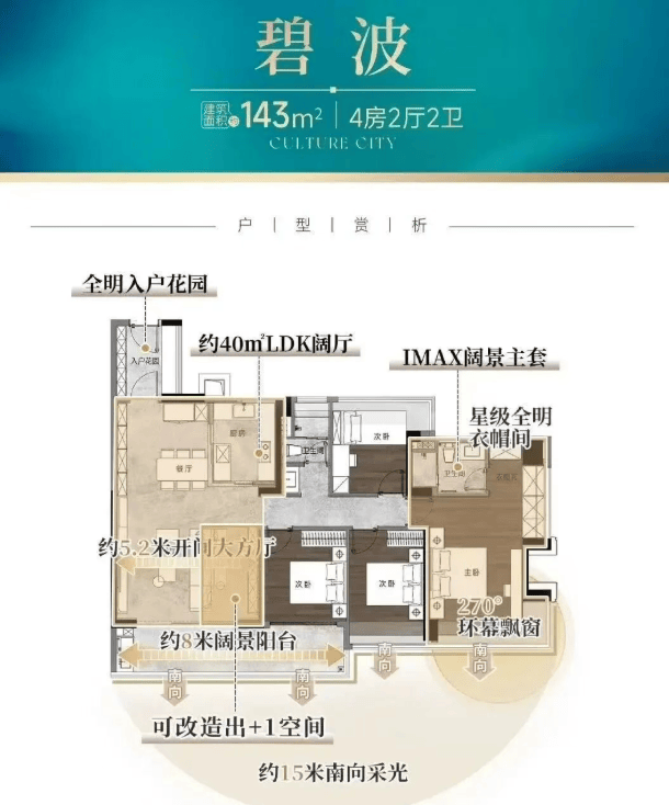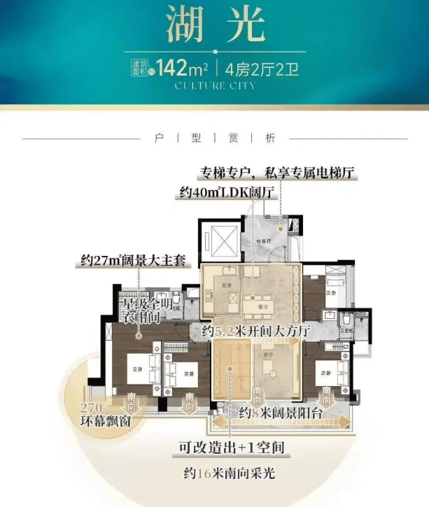 建面约143㎡:四房设计,约16米南向采光,站在约8米全景阳台可俯瞰约1.2万㎡湖景,高层还能望江。