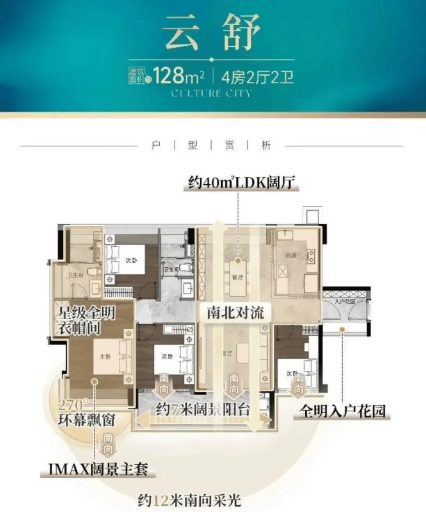 建面约128㎡:四房设计,约16米南向采光、南北对流,约40㎡LDK阔厅,超越市场同面积产品。