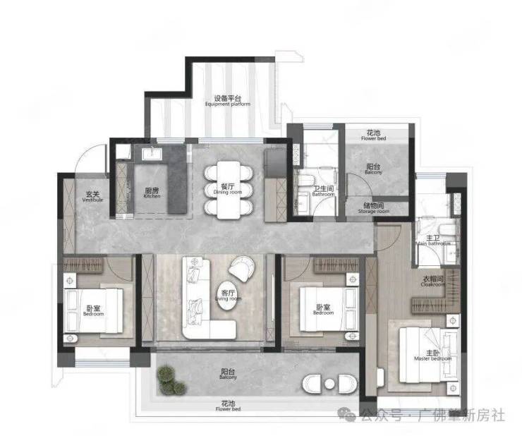 目前在售的户型覆盖刚需到改善需求,得房率超过 100%,每户还配备 5-8㎡的设备平台,相当于额外多出一间房。