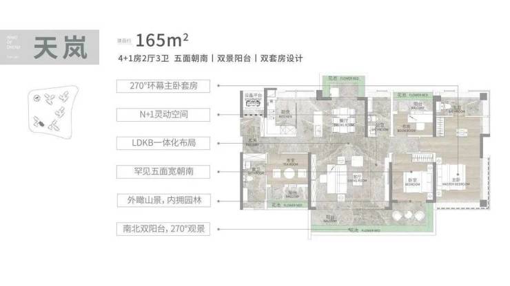 140平、160平都预留了+1的灵活空间,可根据家庭需求,改造成5房。而且都有独立的L型入户玄关,南北双阳台,主卧主卫270°观景飘窗。
