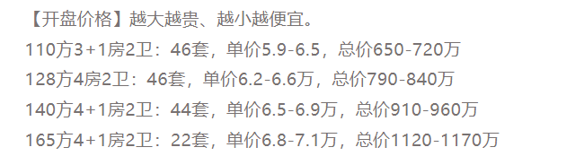 128方4房2卫:46套,单价6.2-6.6万,总价790-840万