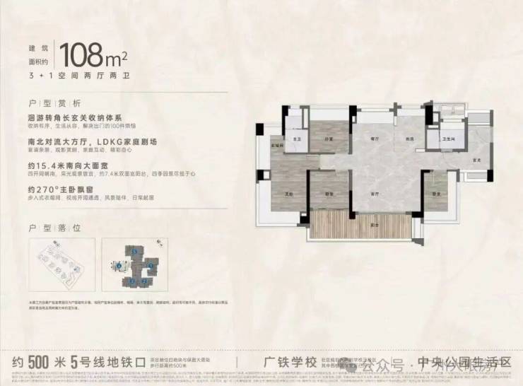 “中央公园”,紧邻大脚印公园,距离地铁约500米,紧邻学校、酒店