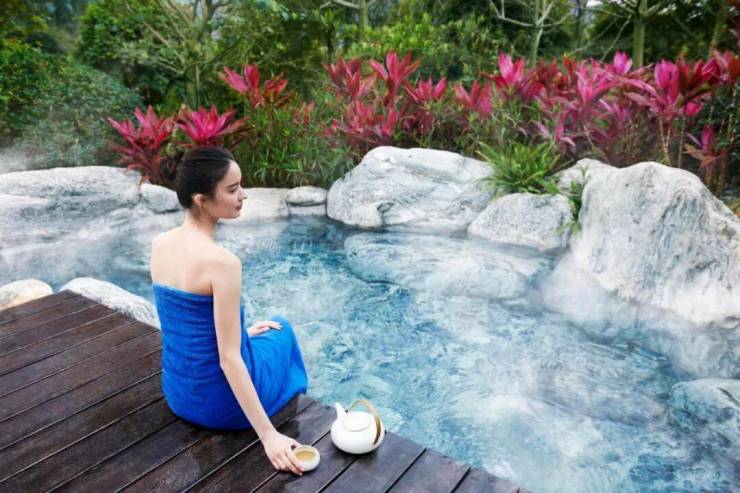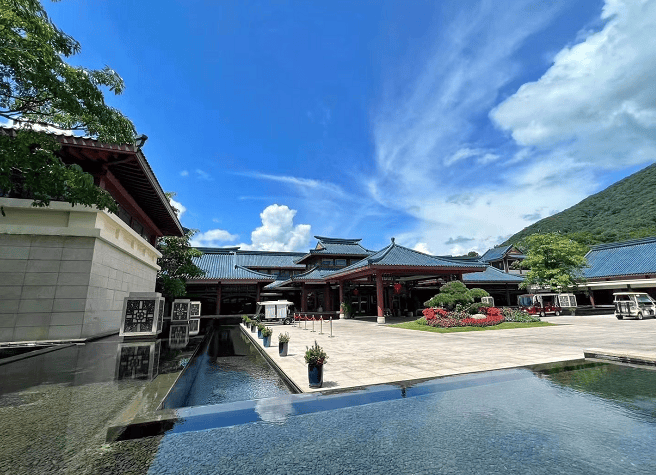 山水、花木、曲径、游廊,再到室外温泉池,远山近水,一步步演绎着东方人居“天人合一”的哲学智慧与情怀。