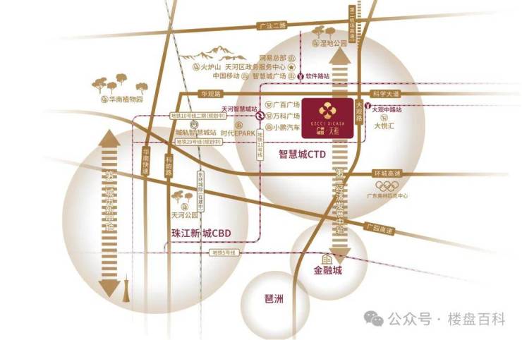 位于广州市天河区华观路和大观中路交汇处,广州地铁21号线天河智慧城站附近;坐落天河智慧城CTD,广州第三经济发展中轴核芯,与珠江新城CBD共同构成“一区双核”的发展格局,将成为广州新的经济增长极。