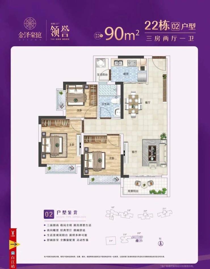 【金泽豪庭】户型设计方正,空间灵动,高得房率;客餐厅一体,扩展室内共享空间,尽显通透美观;阔绰景观阳台,180°景观视野开阔,与四季园林美景坦诚相见;三卧室设计,进可享三代同堂,其乐融融;退可互不干扰,兼顾家族成员所需。