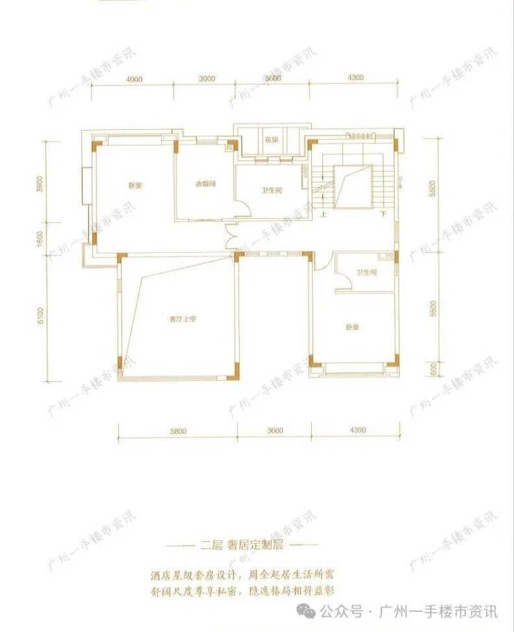别墅二层只设计了两个超大套房(其中一个有配备衣帽间),二层套房超大的空间设计可以供业主小孩使用。