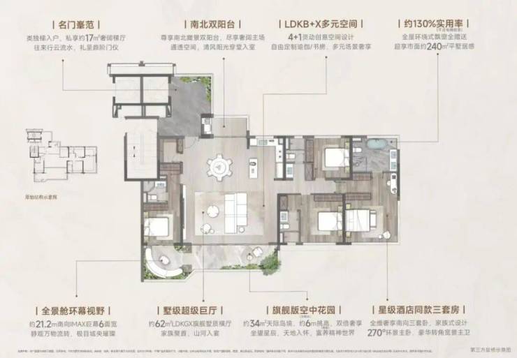 【169㎡天颂】约62㎡墅级横厅铺陈约21.2米南向采光面,约130%极致实用率(不含电梯前厅)重构约240㎡生活版图。约6米挑高空中会客厅悬浮于云端,于自然诗意中,启幕塔尖人生。